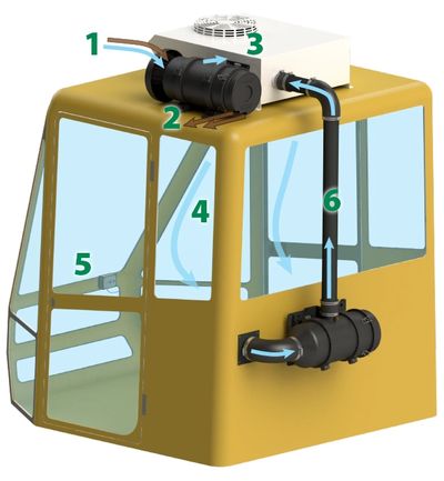 El aire limpio y filtrado se entrega a la unidad HVAC sin restricción adicional por parte de la unidad RESPA motorizada. Esto crea una presión positiva, por lo que la cabina no aspira polvo.